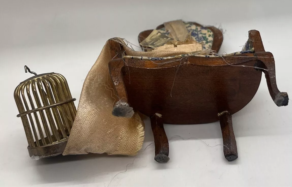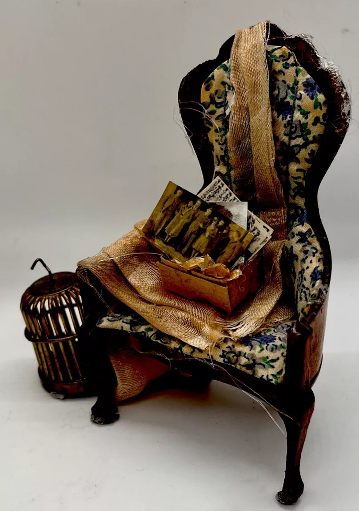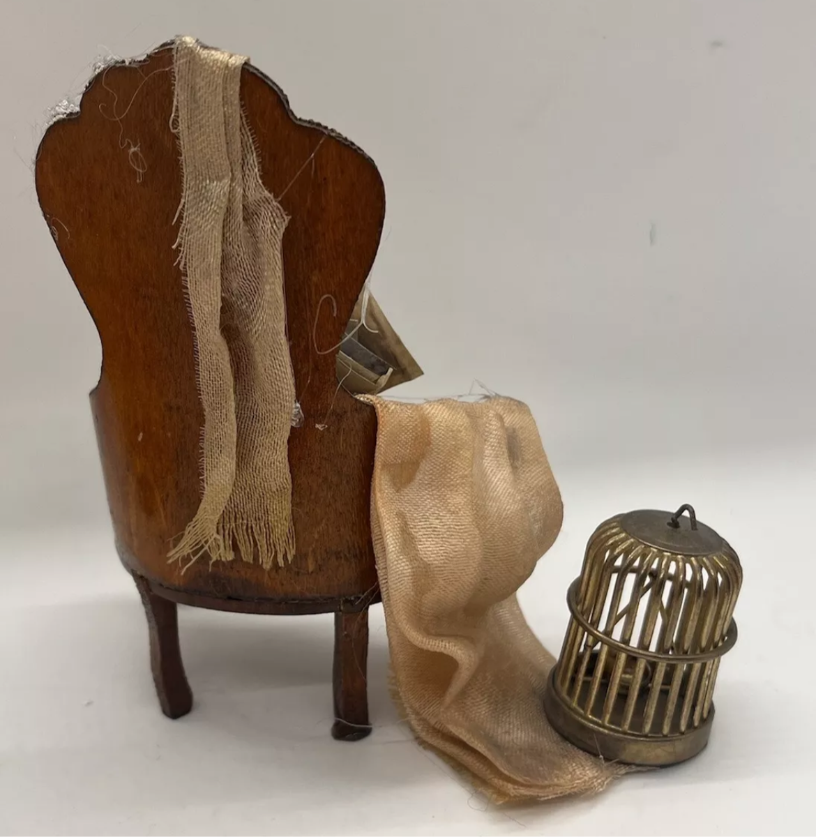 Dolls house old attic loft items, dusty backdrop. Old chair bird cage.