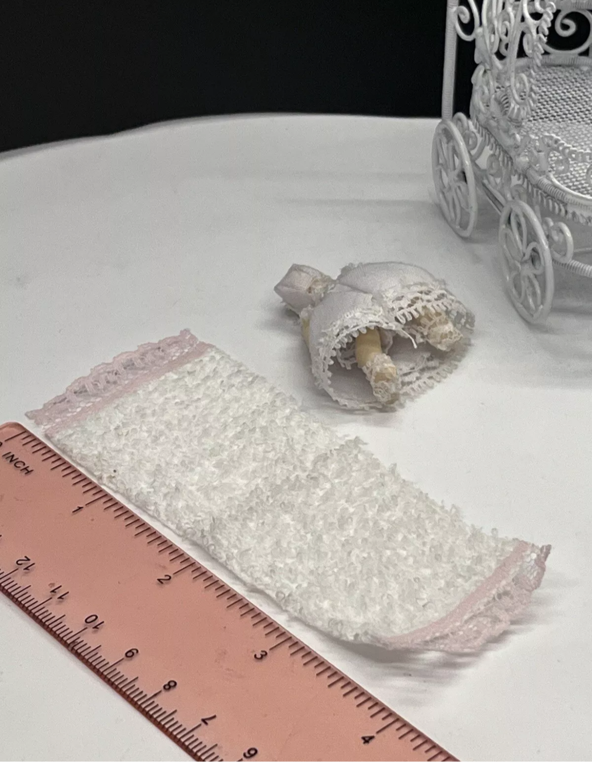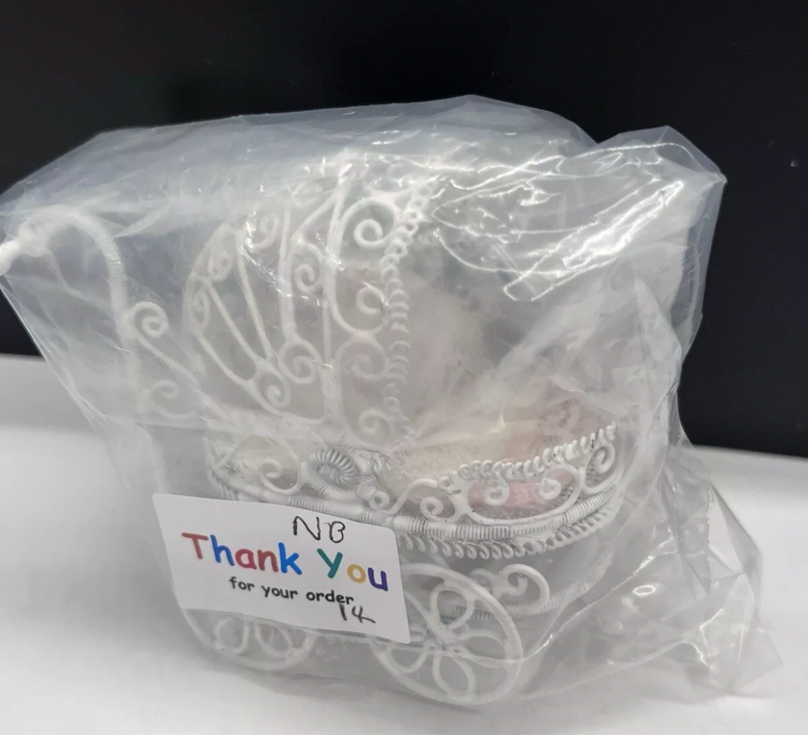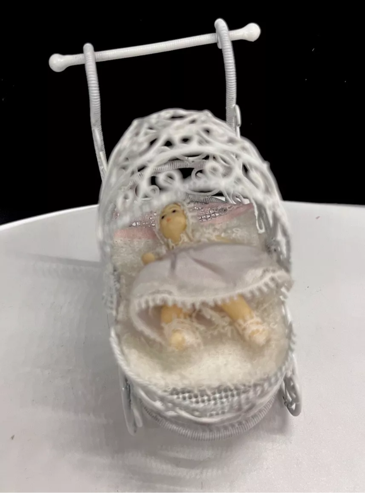 Dolls house metal white wire pram and baby.